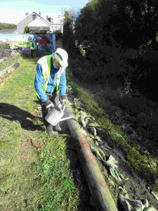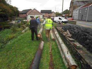 Today was all about creating a community garden at the Swansea Canal Centre. This project has been made possible by a most generous grant of £3,700 from the Statkraft Fund administered by the Swansea Greener Grid Park Community Fund. The weather was bright and warm as the first phase of the garden was to lay an edge to new flower beds using the telegraph poles left over after creating the low-level path along the canal. Very hard work, made all the harder by Gordon hitting metal whilst using his chainsaw. A quick dash home to sharpen the saw and he was soon back in action. |