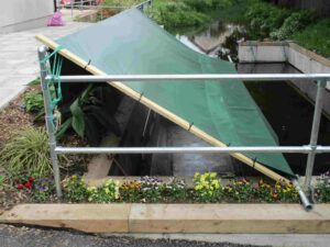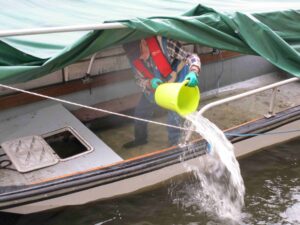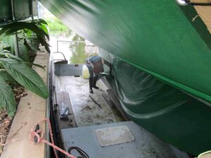 The first attempt at sheltering the boat proved insufficient to withstand the dreadful weather of last Thursday so Bob baled out the boat once again before he and Andy attempted to rig the tarpaulin in a sturdier manner. Fingers crossed! |