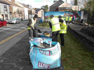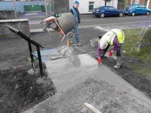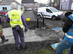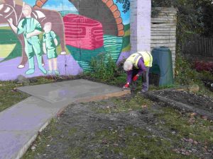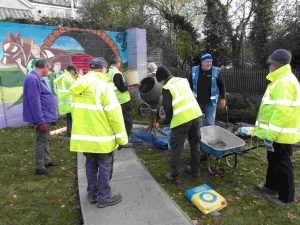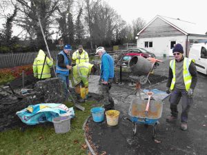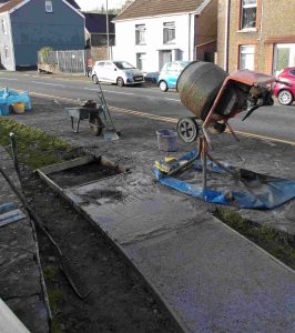 The first really cold day of the winter, plus a few light showers later on, but nothing stops our volunteers who were quickly warming up with hard graft at the Swansea Canal Centre. The main task was to complete the hard standing for the community garden. Vast quantities of concrete were mixed and then levelled into place. First, the second table area was filled and the the path leading to it was finished. That just left the short path to the first table area. We also concreted in place a frame for an information panel. A bit of left-over concrete was used to cover some tiles alongside the canal and the job was done. Phew, a lot of hard work over the last three Tuesdays! |