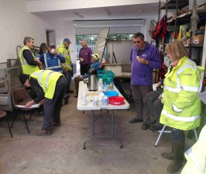 Tea was eventually taken in the the workshop. Eventually is the key word here as the brawny but not necessarily brainy concreting team pitched up, realised they didn’t know how to boil a kettle and retuned to work until John Gw managed to fathom the technology. Delicious cakes were provided by Jan W and Margaret. |