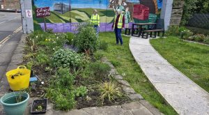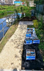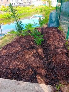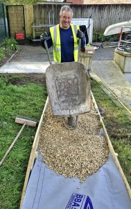 The Old School Nursery garden centre delivered a bulk load of landscape bark – thank you Lee! As the final job of the morning, Phil and Ian laid more membrane and spread the bark as a weed suppressant around the first slab. |