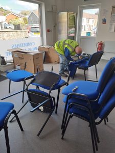 Sharon and Pete assembled eight new chairs for the meeting room. |