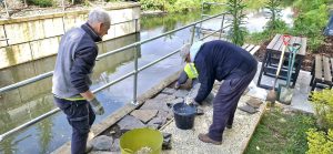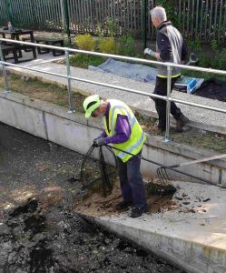 John Gw fished assorted muck out of the boat basin. Andy, devoid of photographic record, cleared to bench in the workshop. |