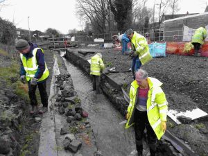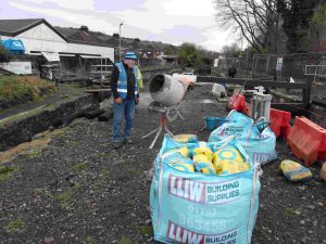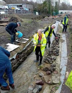 Another glorious day and another chance for the volunteers to work at two locations on tasks that continued before and after the tea break. One group went to the Buried Lock site in Clydach where they continued to line the by-wash. Lance and Phil mixed the mortar and delivered it to the by-wash. Andy and new recruit Ian retrieved slag lumps and passed them to the laying team of Sue, Chris, James and Alan. Another few yards done today, making the job maybe 75% complete. |