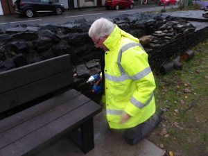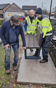 The rain eased off for the rest of the morning so the last of the bench seating could be manoeuvred into place and screwed down securely. |