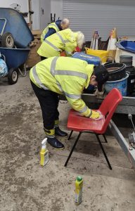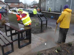 Back at the Centre, the first job was to clean the chairs, mercifully inside the workshop. |